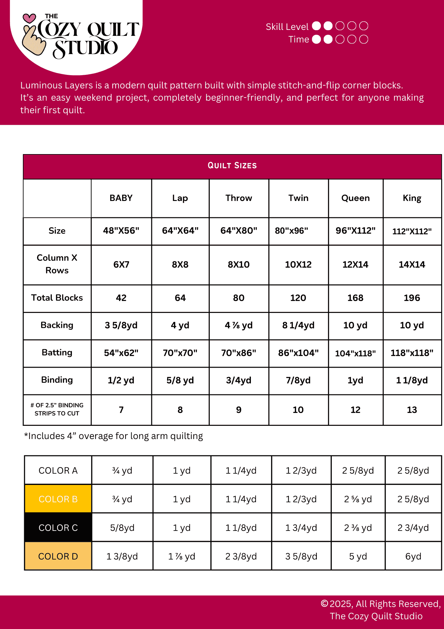 • Time to Sew: Baby size can be finished in a single day; Throw size in a weekend.
